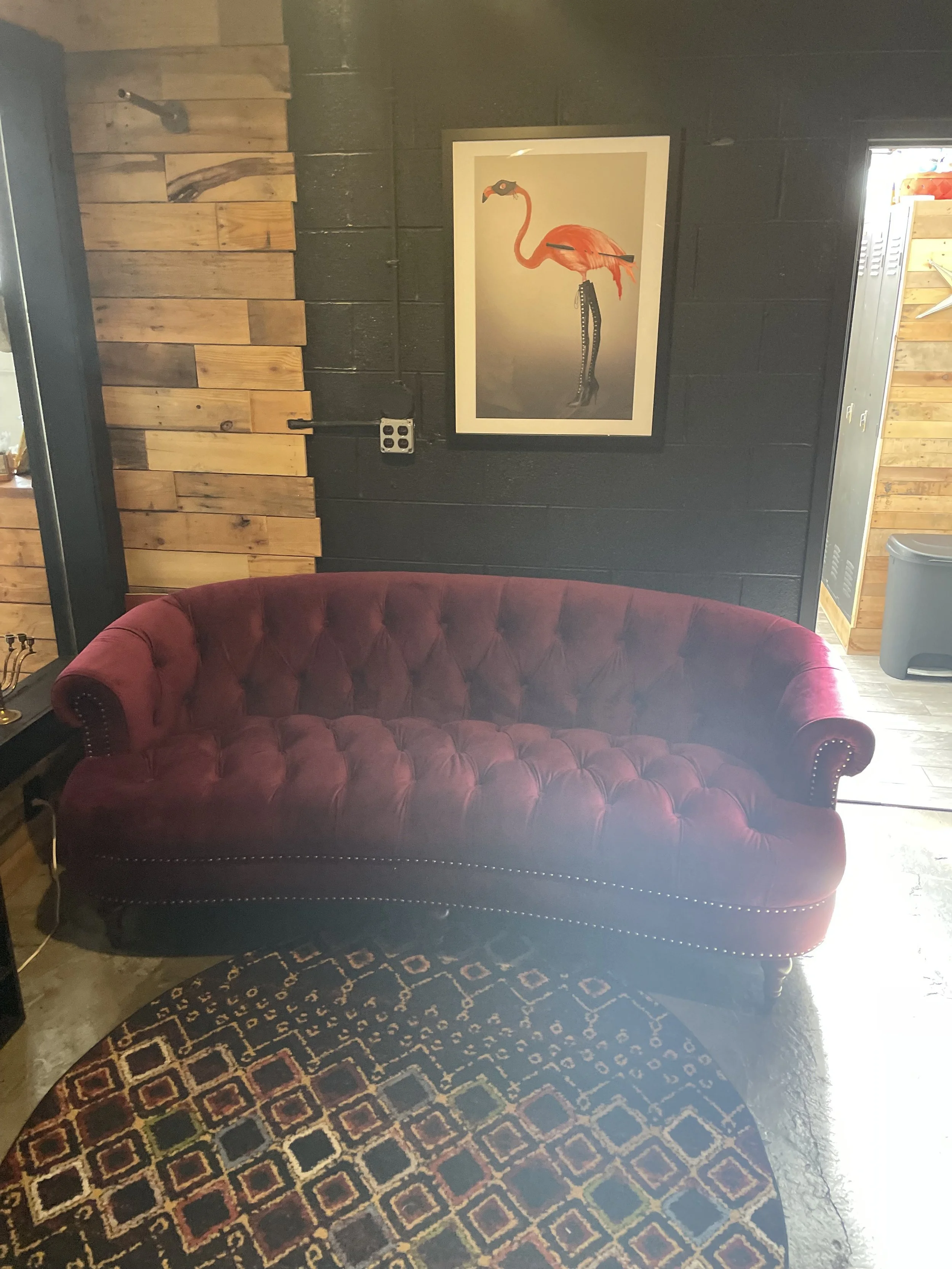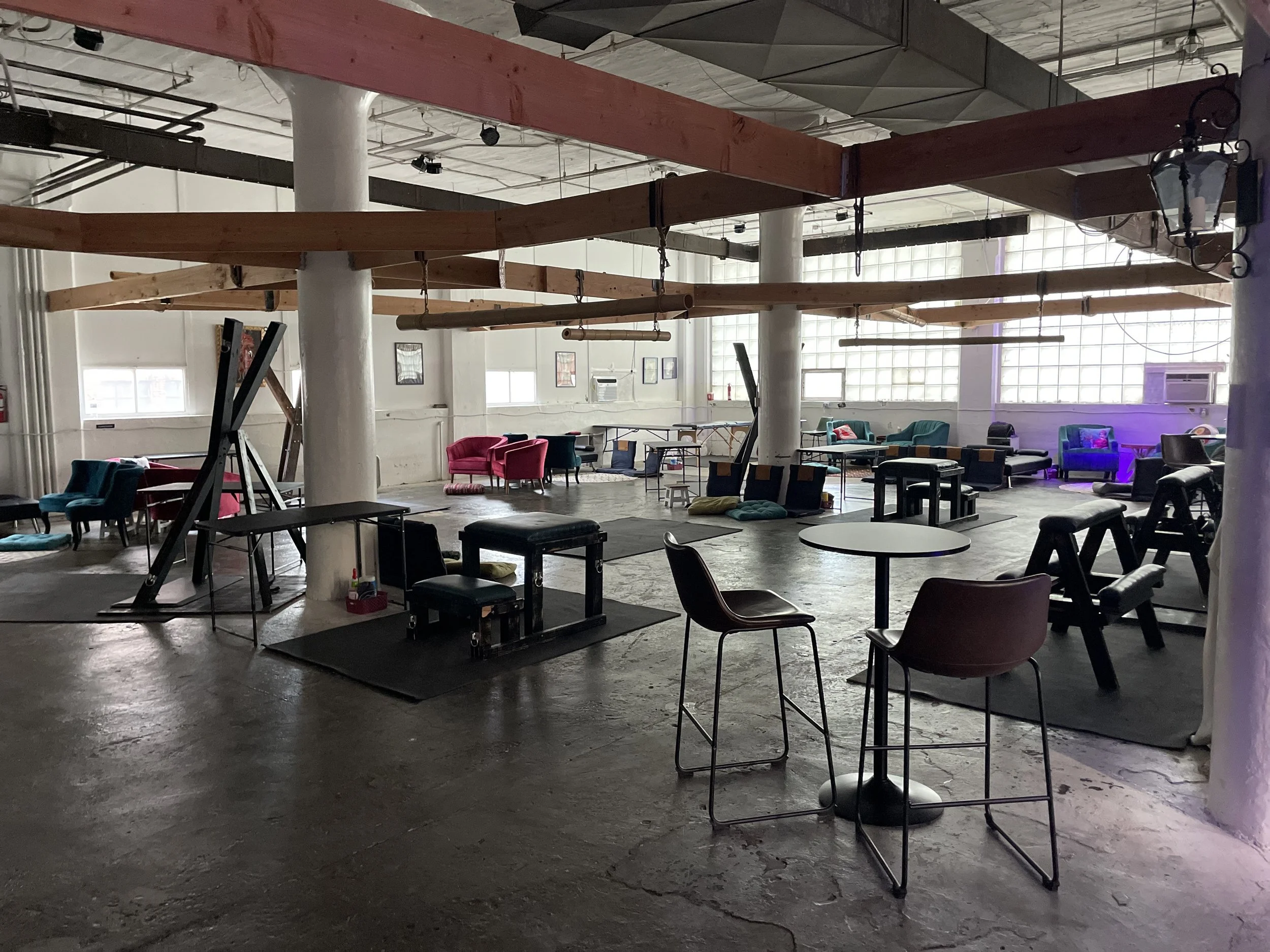 Encompassing the entire 2nd floor of our building and spanning 7,000 sqft. Our space is equal parts shibari studio, dungeon space and lounge, with 25 hard points for suspension, 30+ pieces of BDSM play furniture, 25 conversational seating areas suitable for socializing and/or play. Elegant and comfortable with more amenities than we can list.