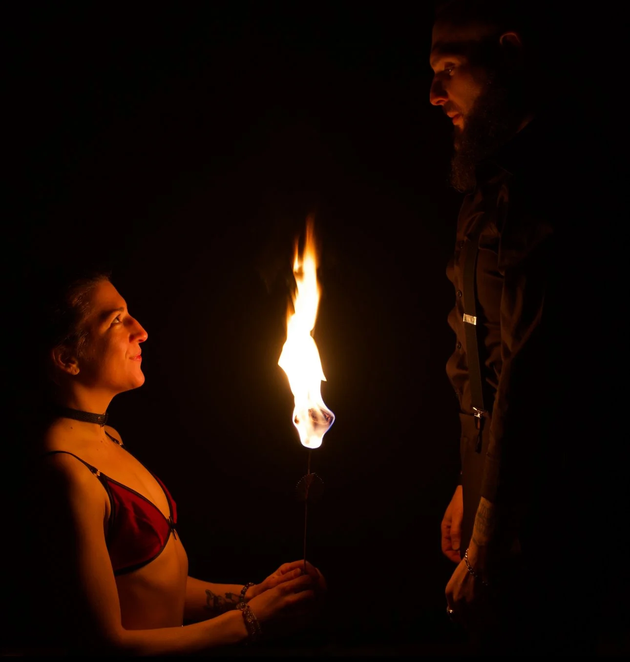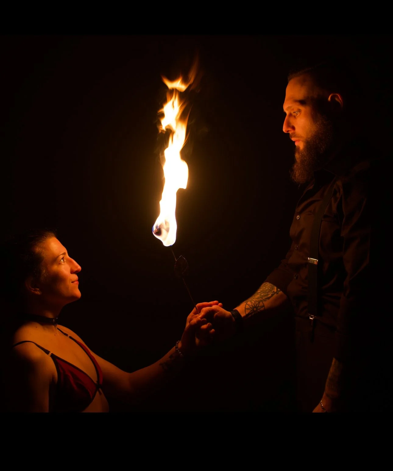 Wicked and Scarlet Fox are captivating fire artists and presenters whose flames dance with the same intensity as the passions they invoke. With years of experience in the realms of both kink and performance art, they expertly fuse sensuality, danger, and allure, creating mesmerizing shows and class that push the boundaries of desire.